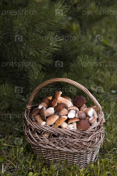 Boletus edulis белые лесные грибы в плетеной корзине. Благородный королевский гриб. Белый гриб. Сбор грибов в лесу