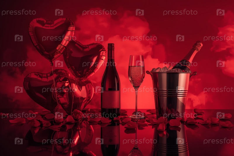 Концепция Дня святого Валентина. Романтическая аранжировка с шампанским, бокалами, неоновым знаком и воздушными шарами в форме сердца на День святого Валентина