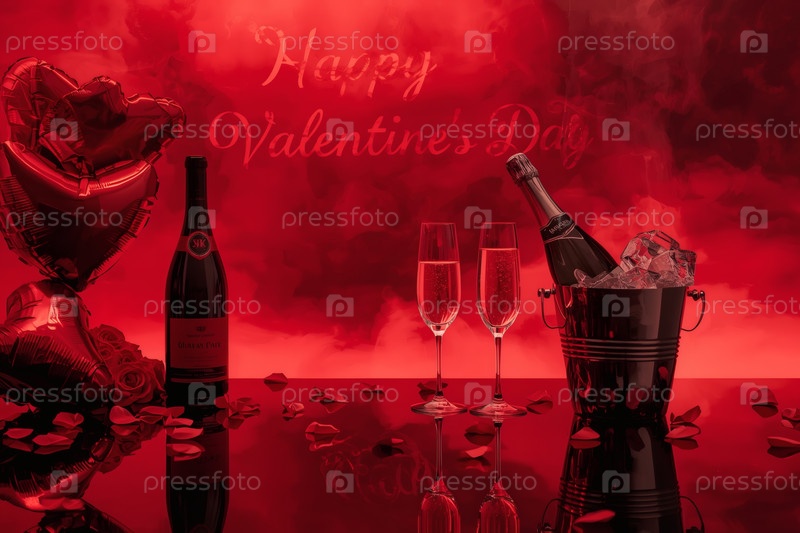 Концепция Дня святого Валентина. Романтическая аранжировка с шампанским, бокалами, неоновым знаком и воздушными шарами в форме сердца на День святого Валентина