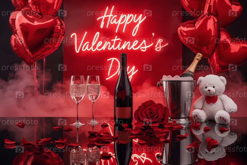 Концепция Дня святого Валентина. Романтическая аранжировка с шампанским, бокалами, неоновым знаком и воздушными шарами в форме сердца на День святого Валентина