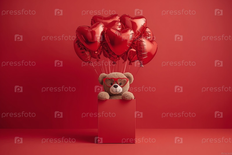 Концепция Дня святого Валентина. Минимализм. Подарок с плюшевым медведем и воздушными шарами на красном студийном фоне