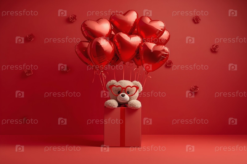 Концепция Дня святого Валентина. Минимализм. Подарок с плюшевым медведем и воздушными шарами на красном студийном фоне