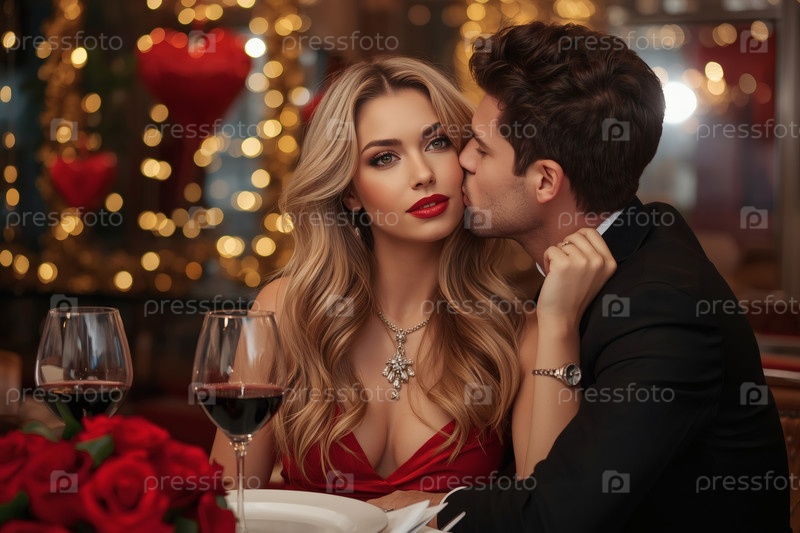 Концепция Дня святого Валентина. Элегантная влюбленная пара наслаждается романтическим ужином при свечах с бокалами вина в роскошный вечер