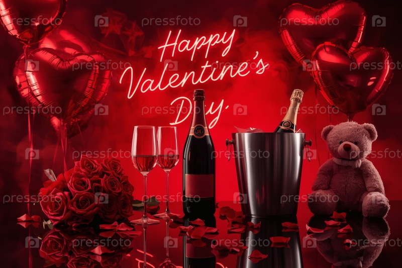 Концепция Дня святого Валентина. Романтическая аранжировка с шампанским, бокалами, неоновым знаком и воздушными шарами в форме сердца на День святого Валентина
