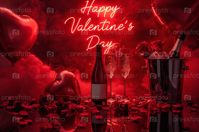 Концепция Дня святого Валентина. Романтическая аранжировка с шампанским, бокалами, неоновым знаком и воздушными шарами в форме сердца на День святого Валентина