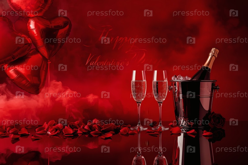 Концепция Дня святого Валентина. Романтическая аранжировка с шампанским, бокалами, неоновым знаком и воздушными шарами в форме сердца на День святого Валентина