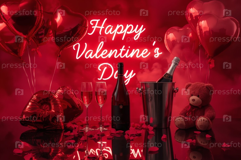 Концепция Дня святого Валентина. Романтическая аранжировка с шампанским, бокалами, неоновым знаком и воздушными шарами в форме сердца на День святого Валентина