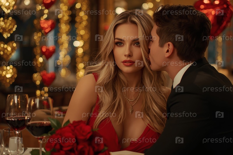 Концепция Дня святого Валентина. Элегантная влюбленная пара наслаждается романтическим ужином при свечах с бокалами вина в роскошный вечер