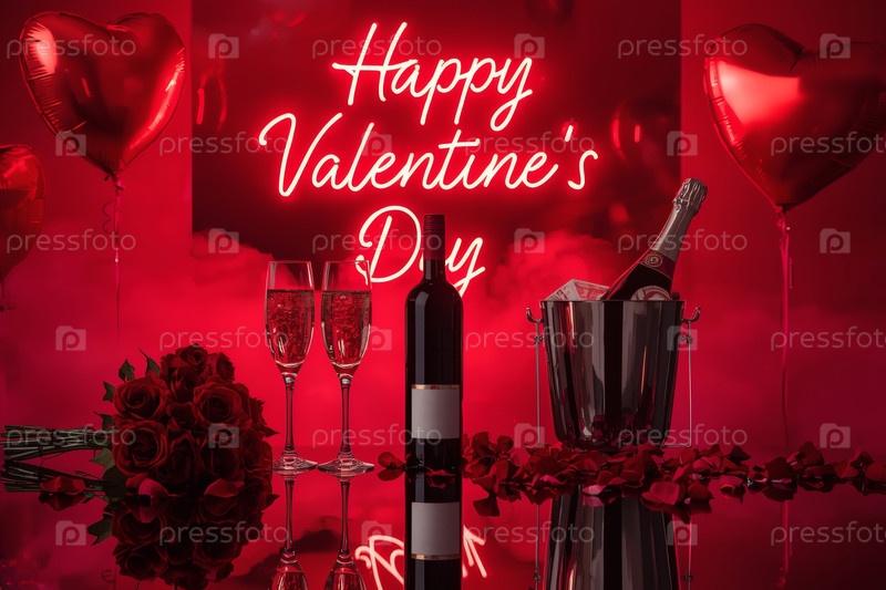 Концепция Дня святого Валентина. Романтическая аранжировка с шампанским, бокалами, неоновым знаком и воздушными шарами в форме сердца на День святого Валентина