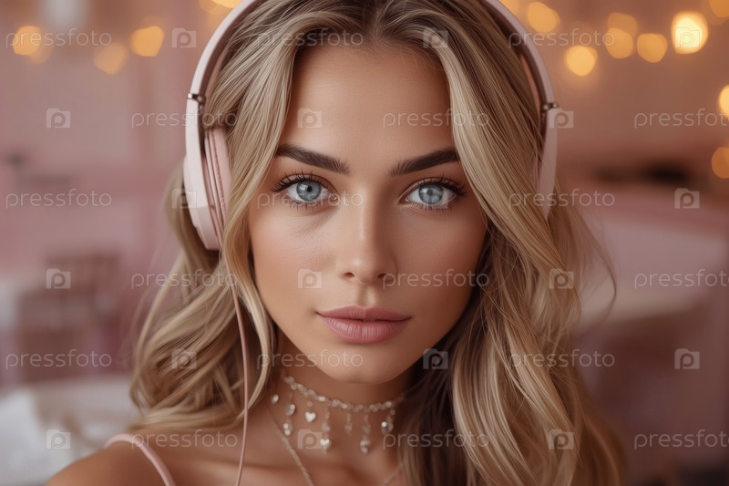 Молодая красивая блондинка с выразительными голубыми глазами слушает музыку в больших беспроводных наушниках на размытом фоне кафе с мягким розовым интерьером. Любитель музыки