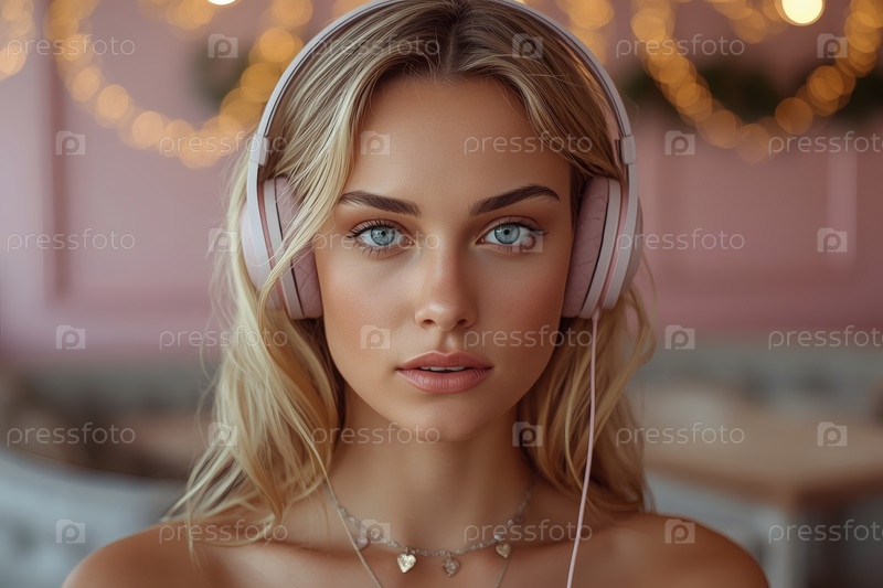 Молодая красивая блондинка с выразительными голубыми глазами слушает музыку в больших беспроводных наушниках на размытом фоне кафе с мягким розовым интерьером. Любитель музыки