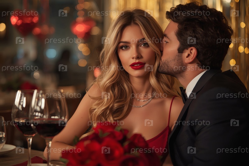 Концепция Дня святого Валентина. Элегантная влюбленная пара наслаждается романтическим ужином при свечах с бокалами вина в роскошный вечер