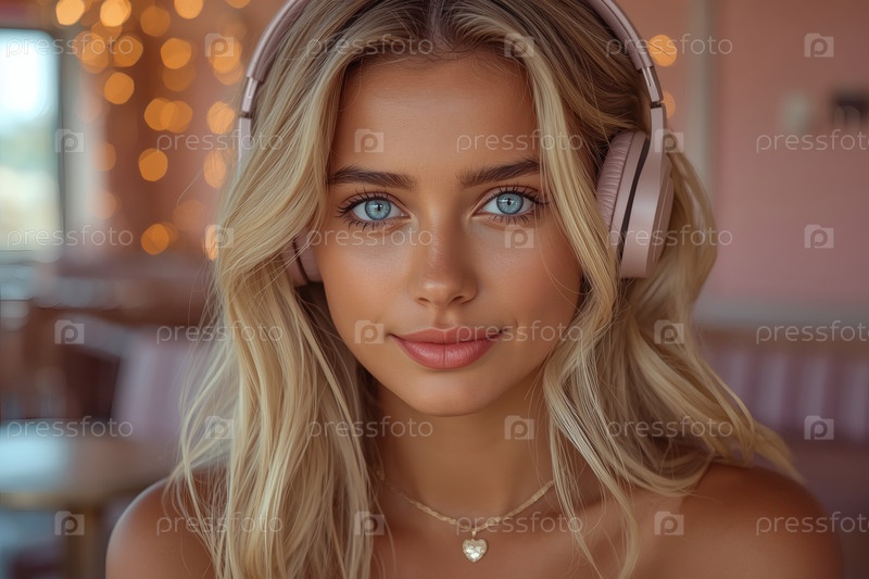 Молодая красивая блондинка с выразительными голубыми глазами слушает музыку в больших беспроводных наушниках на размытом фоне кафе с мягким розовым интерьером. Любитель музыки