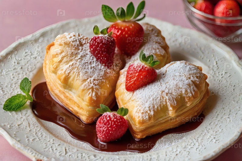 Домашние торты в форме сердца с розовым шоколадом и свежей клубникой. Пироги в форме сердца на светлом фоне. Свежеиспеченный десерт на День святого Валентина