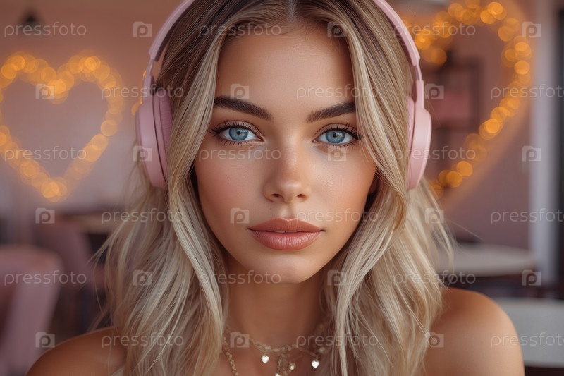 Молодая красивая блондинка с выразительными голубыми глазами слушает музыку в больших беспроводных наушниках на размытом фоне кафе с мягким розовым интерьером. Любитель музыки