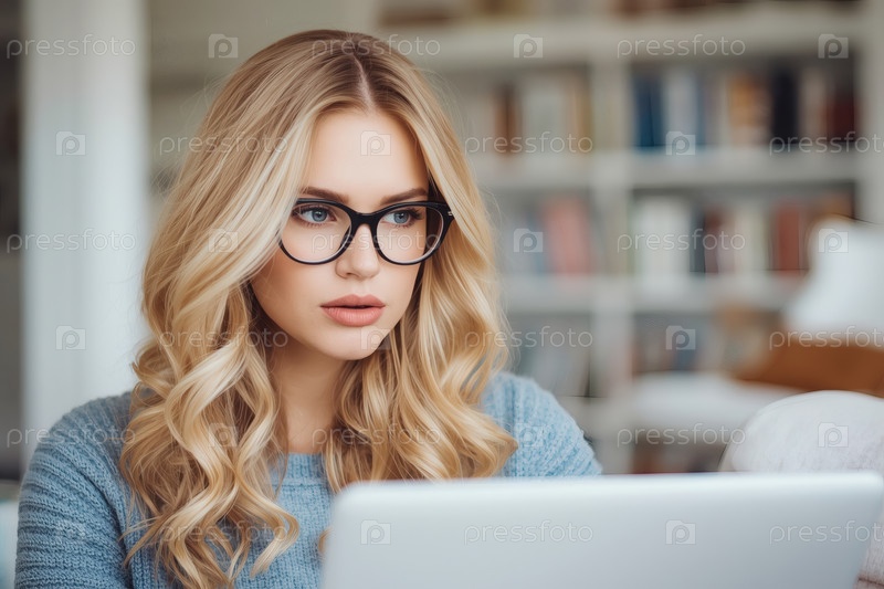 Молодая, красивая внештатная бизнесвумен в очках, сидящая в домашнем офисе с ноутбуком. Женщина работает дома или совершает покупки онлайн