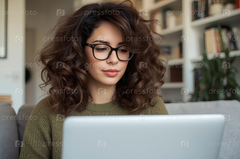 Молодая, красивая внештатная бизнесвумен в очках, сидящая в домашнем офисе с ноутбуком. Женщина работает дома или совершает покупки онлайн