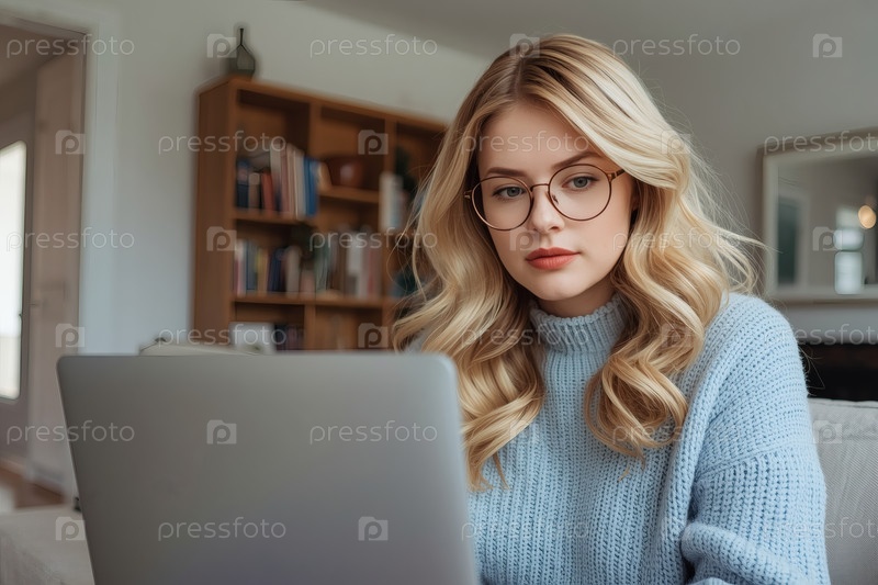 Молодая, красивая внештатная бизнесвумен в очках, сидящая в домашнем офисе с ноутбуком. Женщина работает дома или совершает покупки онлайн