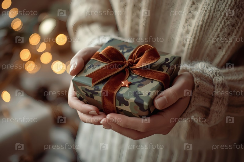Концепция праздника 23 февраля. Замысел руки женщины, держащей подарок в камуфляжной обертке с атласным луком ко Дню защитника Отечества