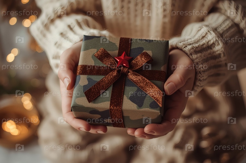Концепция праздника 23 февраля. Замысел руки женщины, держащей подарок в камуфляжной обертке с атласным луком ко Дню защитника Отечества