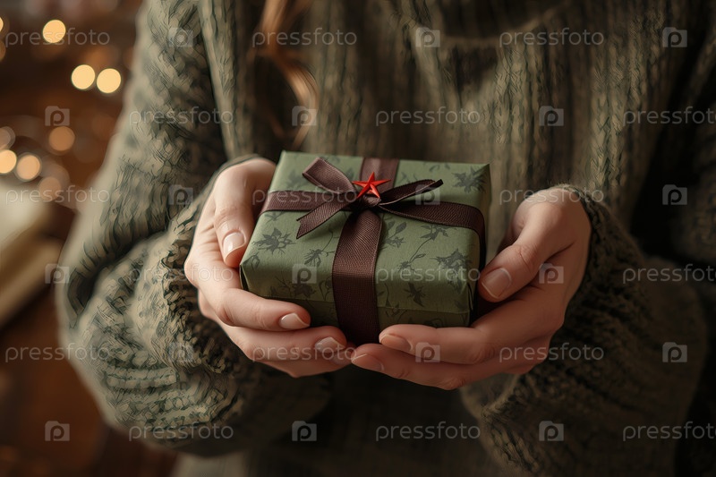 Концепция праздника 23 февраля. Замысел руки женщины, держащей подарок в камуфляжной обертке с атласным луком ко Дню защитника Отечества