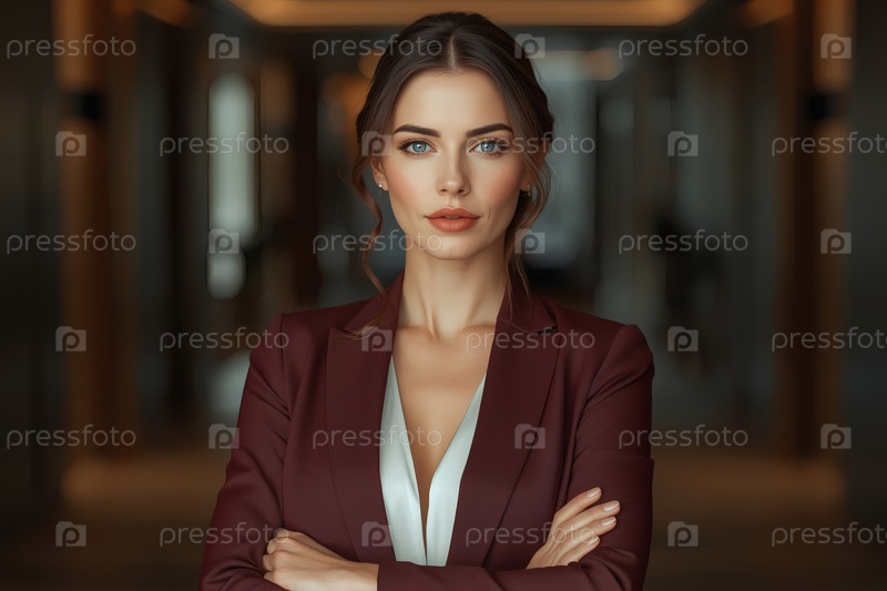 Деловая элегантная женщина со светлыми волосами. Она одета в повседневный дорогой бордовый блейзер или куртку. Скрестив руки на груди, она смотрит прямо в камеру