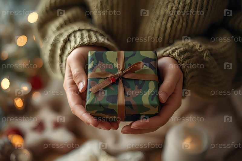 Концепция праздника 23 февраля. Замысел руки женщины, держащей подарок в камуфляжной обертке с атласным луком ко Дню защитника Отечества