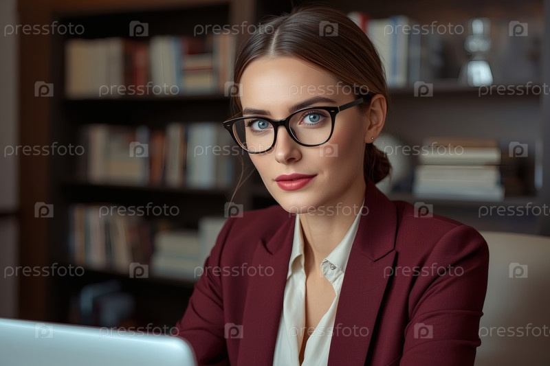 Молодая, красивая и элегантная бизнесвумен в официальном блейзере, сидящая в офисе премиум-класса с ноутбуком. Женщина работает на компьютере