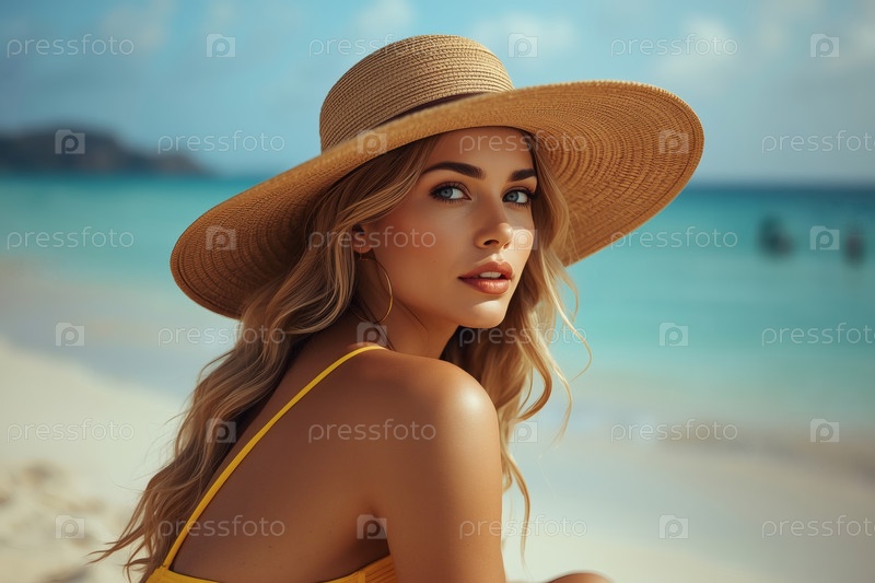 Женщина в отпуске, в купальнике и широкополой соломенной шляпе, сидит на пляже в солнечный день