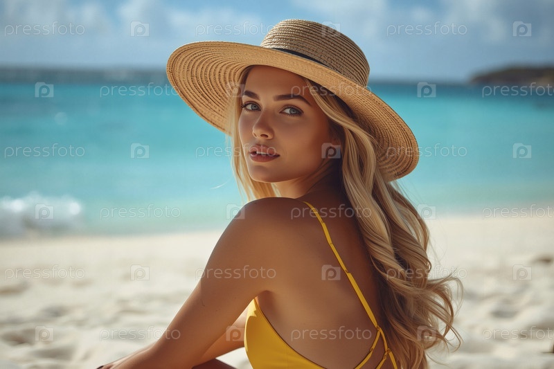 Женщина в отпуске, в купальнике и широкополой соломенной шляпе, сидит на пляже в солнечный день