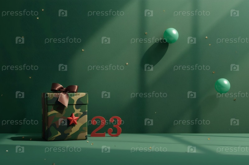 Концепция празднования Дня защитника Отечества 23 февраля. Подарочную камуфляжную коробку с праздничным атласным ленточным луком на зеленом фоне