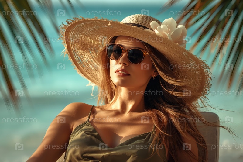 Элегантная, роскошная, красивая женщина на отдыхе, в широкополой соломенной шляпе и солнцезащитных очках, сидящая на пляжном шезлонге в солнечный день
