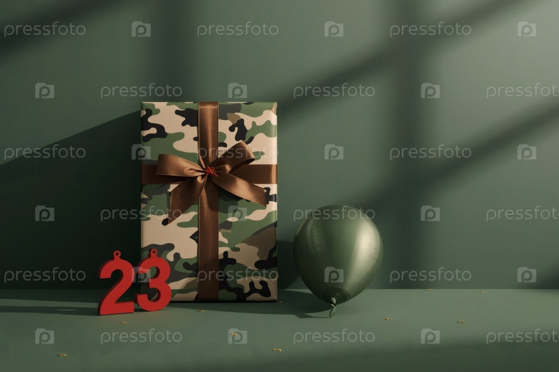Концепция празднования Дня защитника Отечества 23 февраля. Подарочную камуфляжную коробку с праздничным атласным ленточным луком на зеленом фоне