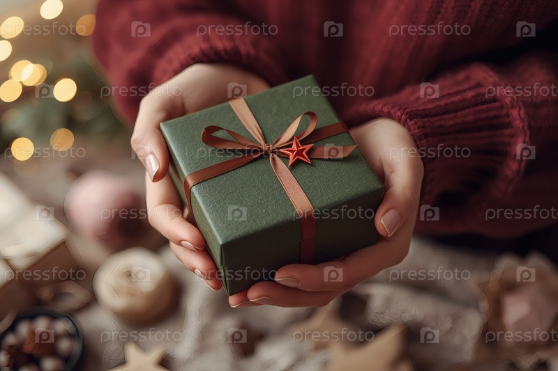 Концепция праздника 23 февраля. Замысел руки женщины, держащей подарок в камуфляжной обертке с атласным луком ко Дню защитника Отечества