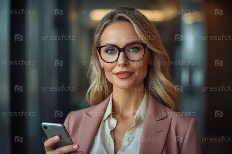 Бизнес-ориентированная блондинка с волнистыми волосами. Она носит обычный пыльный розовый блейзер или куртку. Она держит в руках смартфон
