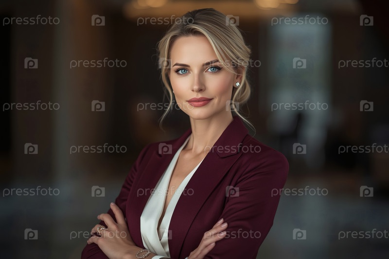 Элегантная бизнесвумен со светлыми волосами. Она одета в повседневный, дорогой бордовый блейзер или куртку. Она смотрит прямо в камеру, скрестив руки над грудью