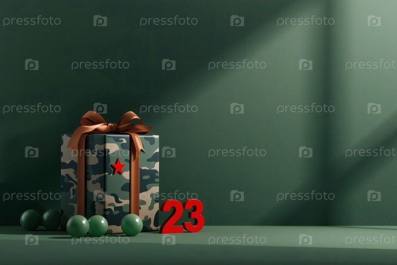 Концепция празднования Дня защитника Отечества 23 февраля. Подарочную камуфляжную коробку с праздничным атласным ленточным луком на зеленом фоне