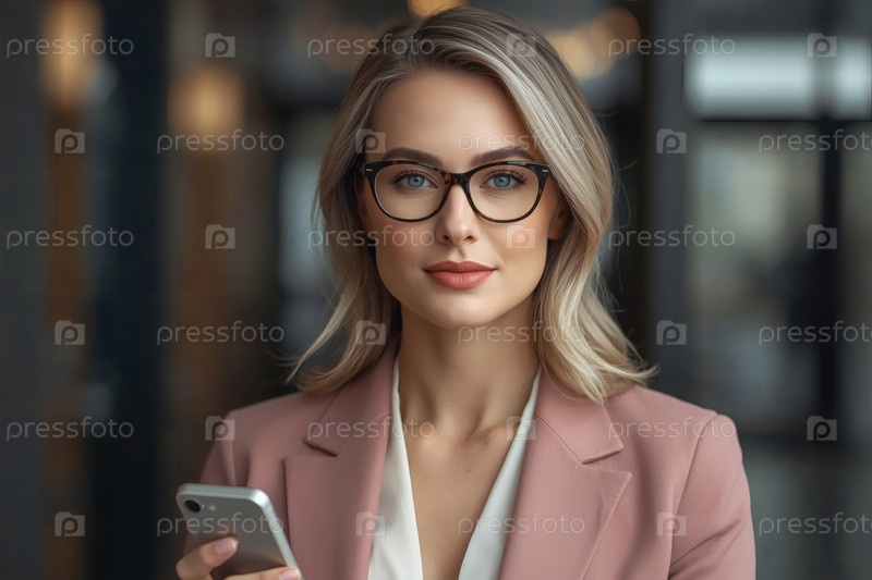Бизнес-ориентированная блондинка с волнистыми волосами. Она носит обычный пыльный розовый блейзер или куртку. Она держит в руках смартфон