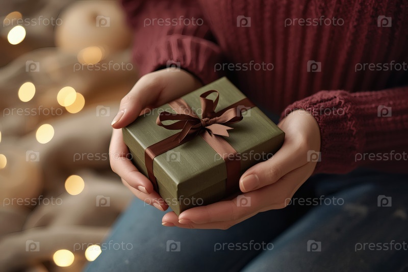 Концепция праздника 23 февраля. Замысел руки женщины, держащей подарок в камуфляжной обертке с атласным луком ко Дню защитника Отечества