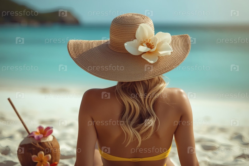 Элегантная, роскошная, красивая женщина на отдыхе, в купальнике и широкополой соломенной шляпе, потягивающая кокосовый коктейль в солнечный пляжный день