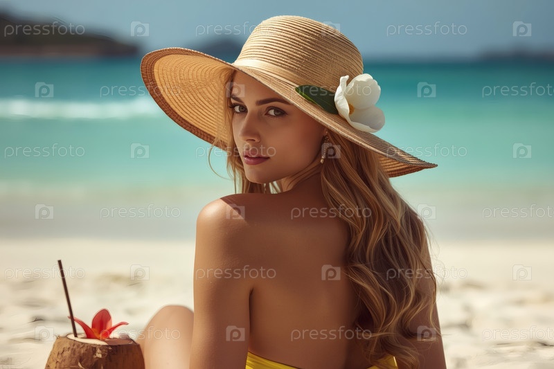 Элегантная, роскошная, красивая женщина на отдыхе, в купальнике и широкополой соломенной шляпе, потягивающая кокосовый коктейль в солнечный пляжный день