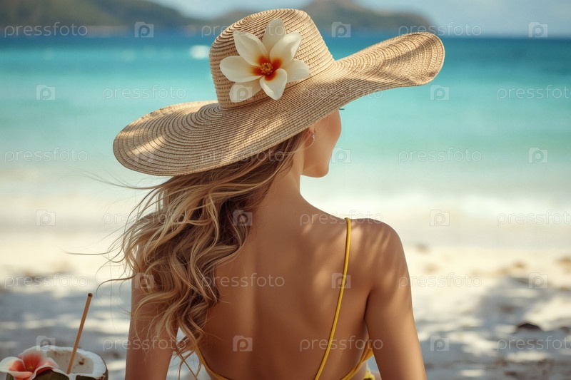 Элегантная, роскошная, красивая женщина на отдыхе, в купальнике и широкополой соломенной шляпе, потягивающая кокосовый коктейль в солнечный пляжный день