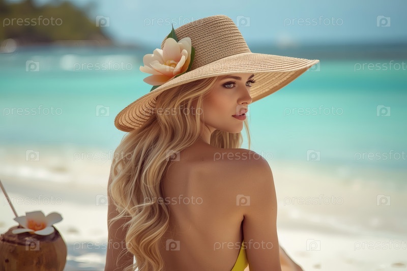 Элегантная, роскошная, красивая женщина на отдыхе, в купальнике и широкополой соломенной шляпе, потягивающая кокосовый коктейль в солнечный пляжный день
