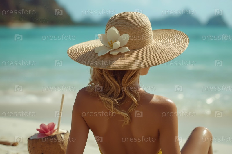 Элегантная, роскошная, красивая женщина на отдыхе, в купальнике и широкополой соломенной шляпе, потягивающая кокосовый коктейль в солнечный пляжный день
