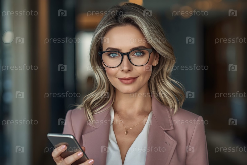 Бизнес-ориентированная блондинка с волнистыми волосами. Она носит обычный пыльный розовый блейзер или куртку. Она держит в руках смартфон