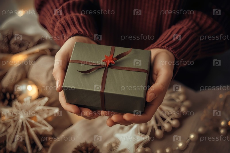 Концепция праздника 23 февраля. Замысел руки женщины, держащей подарок в камуфляжной обертке с атласным луком ко Дню защитника Отечества