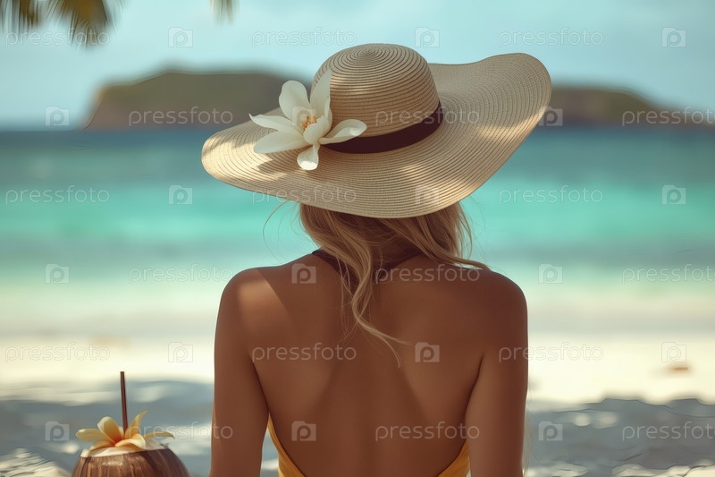 Элегантная, роскошная, красивая женщина на отдыхе, в купальнике и широкополой соломенной шляпе, потягивающая кокосовый коктейль в солнечный пляжный день