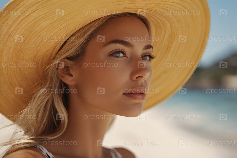 Женщина в отпуске, в купальнике и широкополой соломенной шляпе, сидит на пляже в солнечный день