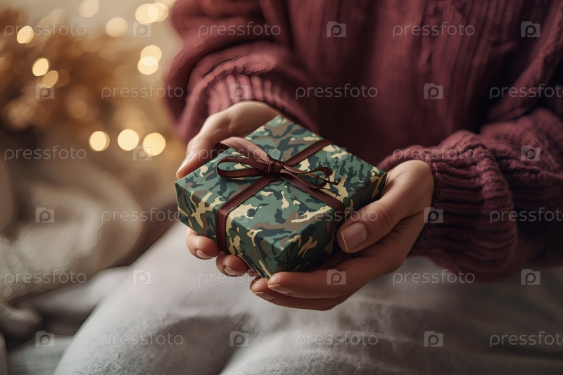 Концепция праздника 23 февраля. Замысел руки женщины, держащей подарок в камуфляжной обертке с атласным луком ко Дню защитника Отечества