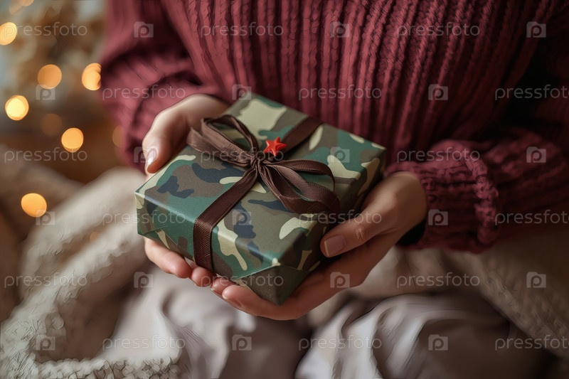 Концепция праздника 23 февраля. Замысел руки женщины, держащей подарок в камуфляжной обертке с атласным луком ко Дню защитника Отечества